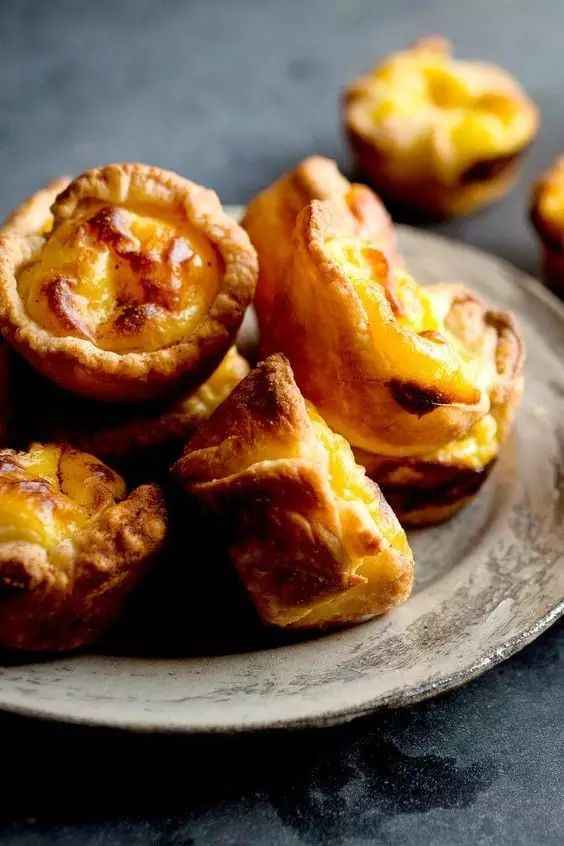 The Portuguese egg tart is a small cream (shortcrust pastry) tart, belonging to one type of egg tart, with a characteristic (charred) surface. The British brought Portuguese egg tarts to Macau and modified them by using a British - style custard filling and reducing the amount of sugar. Soon, they attracted a large number of people) and became a famous snack in Macau. The outer layer of the Portuguese egg tart is crispy and flaky, while the inner custard filling is smooth and creamy. The slight char on the surface not only adds a unique visual feature but also brings a hint of caramel flavor, making it a favorite dessert for many.