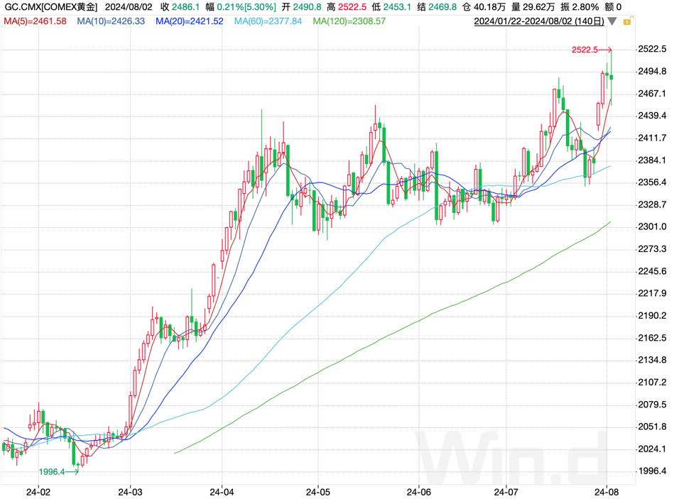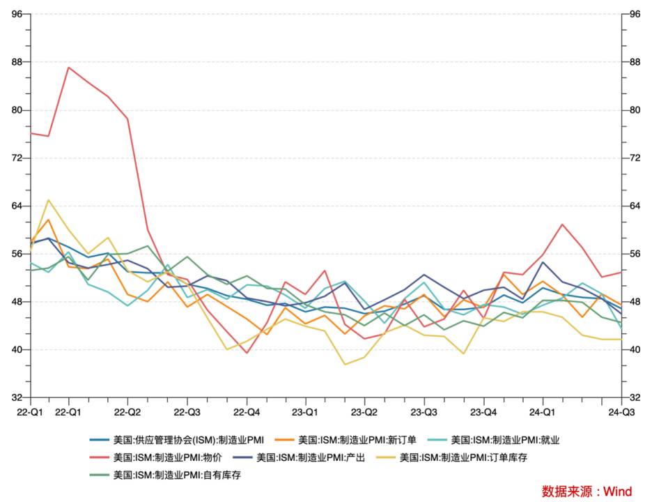 (August 1), U.S. stocks suddenly twisted downward and plunged for two consecutive trading days, and risk aversion triggered a surge in gold prices in the short term. Figure: COMEX gold price trend; Source: wind, 36 Krypton overseas stock market's sudden change of face, mainly because the United States in July manufacturing PMI appeared to exceed expectations lower, and thus triggered the risk aversion trade. From the value point of view, the U.S. July ISM manufacturing PMI recorded 46.8, significantly lower than the expected value of 49, and the previous value of 48.5, this data triggered the market to the U.S. economy towards recession concerns, pessimistic views and even that the U.S. economy will be a “hard landing”. Figure: U.S. ISM manufacturing PMI; Source: wind, 36 Krypton excessive panic on asset prices have a negative impact, dismantling the structure of the U.S. manufacturing PMI, July's lower than expected mainly by the new orders, employment, output and other sub-items of the weak due to the structure of the PMI is exactly the same as the U.S. employment data, inflation data to form a cross-corroboration between the data. From the fact that the macro data reflected by the U.S. economy has indeed weakened, and as to whether the recession needs to be further tracked. From the point of view of the above weak sub-item, new orders is not a new low, output and employment is a new low, but these two sub-items are mainly suppressed by the level of interest rates, the economy has cooled is the result of the current monetary policy. As for whether the economy has a “hard landing”, but also depends on the interest rate cuts after these suppressed sectors to repair the situation, if the repair is good, there will not be a so-called “hard landing”, and vice versa. Therefore, the current round of recession trading is mainly dominated by investment sentiment, is not expected to last too long, which is due to the market interest rate cuts have higher expectations; at the same time, more than one dimension of the current economic cooling observed, but also for the Federal Reserve interest rate cuts to create favorable conditions; and, the recession trading led to the market adjustment, in the interest rate cuts expected to make money under the effect instead of the opportunity to enter the field.