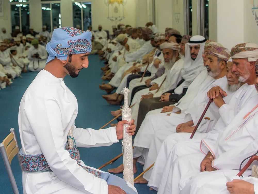 The Al-Khanjar dagger is worn around the waist and includes a belt, handle, blade, sheath, and cover, all made from a variety of materials, including wood, leather, fabric, and silver. These materials, engraved with unique designs, are seen as a reflection of the connection to the land. The Al-Khanjar dagger is also part of the national emblem and plays a key role in many Omani customs and traditions.